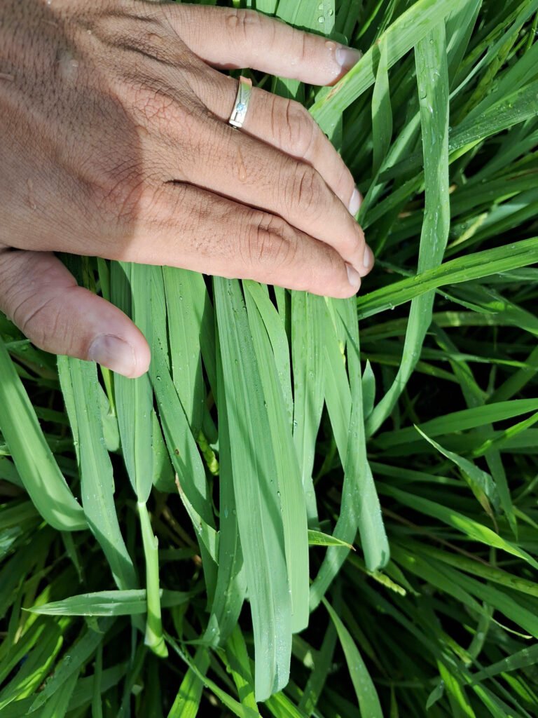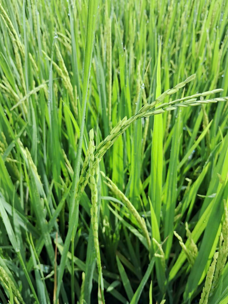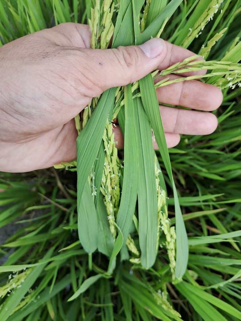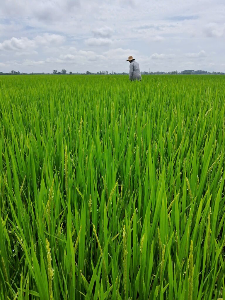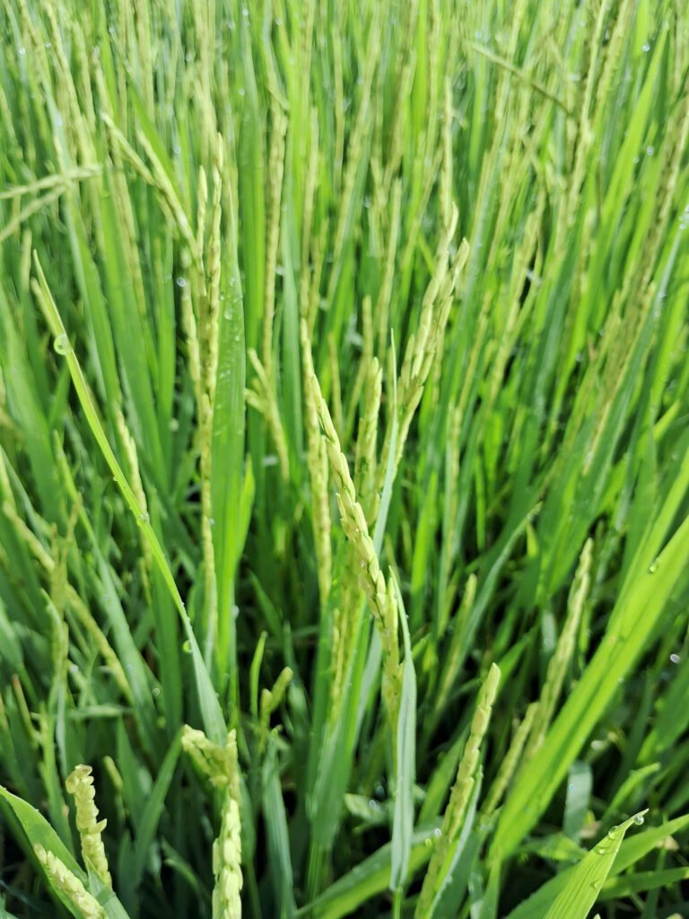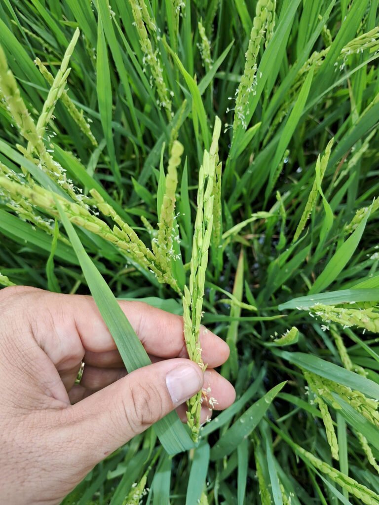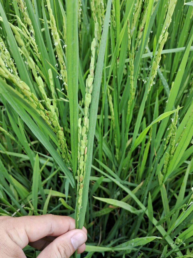- Giống lúa OM18 (68 NSS), đang phát triển tốt và gần trổ đều.